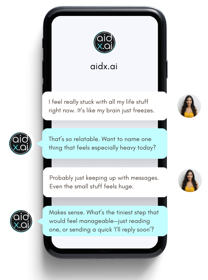 Aidx isn’t therapy for severe issues: it can’t treat things like major depression, psychosis, severe anxiety disorders, personality disorders, or suicidal thoughts. Always reach out to a licensed mental health provider for those.
